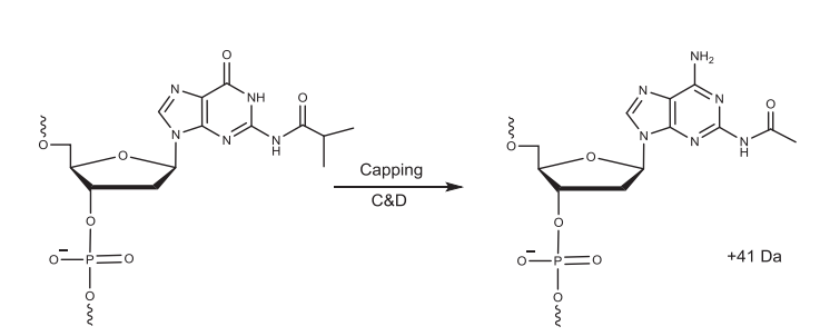 由于不可能达到100%的偶联效率,仍存在脱保护后没有反应的5'-OH活性基团,如果不加处理,那这些基团在下一个循环中仍能发生偶联,产生N-1杂质。通常使用两种试剂(加帽试剂A,通常是醋酸酐;加帽试剂B,通常是N-甲基咪唑,酰化反应的催化剂)来酰化5'-OH。加帽步骤中混合分开存放的试剂A和B,并将其递送至系统中。乙酸酐通过将受保护的鸟嘌呤转化为乙酰化二氨基嘌呤产生比预期多41 Da的杂质。