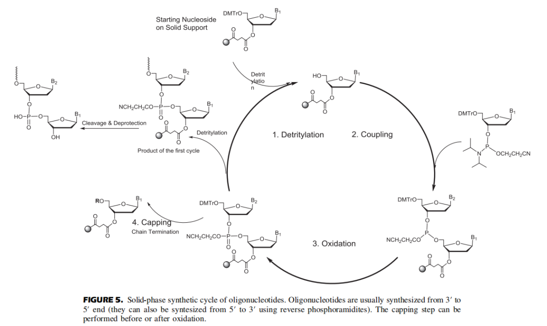 目前寡核酸药物大多通过固相亚磷酰胺化学法进行合成。化学合成按照3'-5'的方向进行。