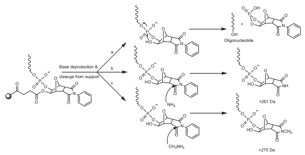 重复循环直至合成所需长度的寡核苷酸。合成结束后,可以采用氨水(或氨水/甲胺的混合物,AMA)处理将寡核苷酸从CPG上断裂并将碱基脱保护(反应速度较慢)。断裂下来的寡核苷酸末端带有游离的3'-OH。使用通用的UnyLinker固定载体时,不完全的断裂将会导致比FLP多261或275 Da的杂质的产生。在较高温度下孵育更长的时间可以将杂质转化为最终的产物。