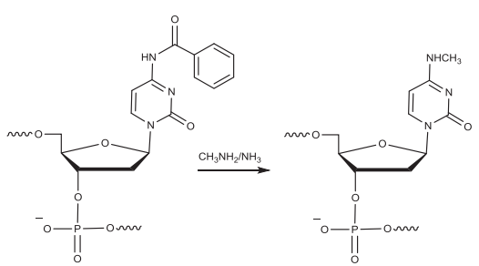 ▲在断裂和脱保护过程中,甲胺与胞苷残基(被苯甲酰基保护)反应形成N-4-甲基胞苷杂质