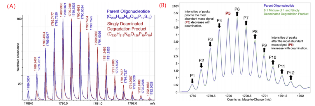脱氨基主要发生在胞嘧啶(C)和5-甲基胞嘧啶残基上,随后得到尿嘧啶(U)和胸腺嘧啶(T),在IP-RP-HPLC分析中通常与磷代寡核苷酸的的主峰共洗脱。由于只比FLP大1 Da,如果在色谱上没有和主峰得到分离,则很难用质谱进行定量。即使在高分辨率的质谱中,杂质和主成分的同位素轮廓也会重叠,导致其定量更加困难。下图(A)所示为寡核苷酸和脱去一个氨基的降解产物在高分辨质谱中脱去四个质子时的同位素轮廓叠加图,1 Da的质量差只导致了同位素轮廓小于0.005 Da的差异。FLP中丰度最高的峰m/z为1790.0021,而脱氨基后的杂质丰度最高的峰则为1790.2481。将FLP和杂质以9:1混合后得到下图(B)所示的质谱图,其中最高信号峰(P5)之前的峰(P1-P4)相比FLP本来的强度有所降低,而P5之后的峰的强度则得到了增加,因此利用两种物质(FLP和其脱氨产物)同位素相对强度的差异可以估计脱氨基寡核苷酸的相对含量。