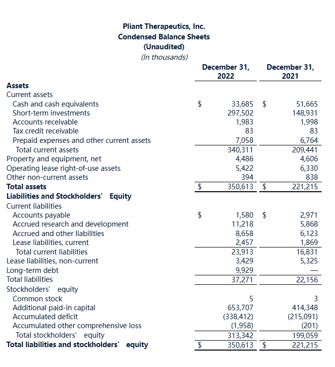 截至2022年12月31日,Pliant拥有约3.312亿美元的现金、现金等价物和短期投资。Pliant预计,公司现有资本资源加上2022年7月和2023年1月公开发行的收益,将足以满足公司到2026年下半年的预计运营需求。