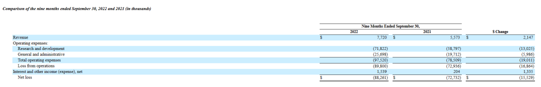 截至2022年9月30日,前九个月的研发费用为7180万美元,而截至2021年9月30日的九个月的研发费用为5880万美元,研发费用增加1300万美元;总务和行政费用为2570万美元,而截至2021年9月30日的九个月的总务和行政费用为1970万美元,增加600万美元,主要是由于员工相关成本,由工资和股票薪酬费用、咨询和其他专业服务费用以及支持与纤维化相关的学术研究的慈善捐款推动。