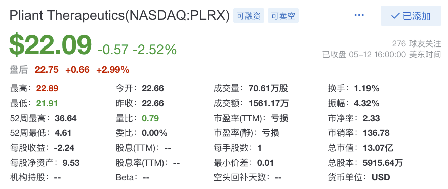 药融圈旗下药融云数据库显示:Pliant Therapeutics,Inc.是一家处于临床阶段的生物制药公司,总部位于美国加利福尼亚州旧金山南部,由世界著名的科学家Dean Sheppard,Rik Derynck,Bill DeGrado和Hal Chapman于2015年创立。Pliant公司于2020年6月3日在纳斯达克市场上市,证券代码:PLRX。截至2023年5月12日,该公司的股价为22.09美元/股,市值为13.07亿美元。