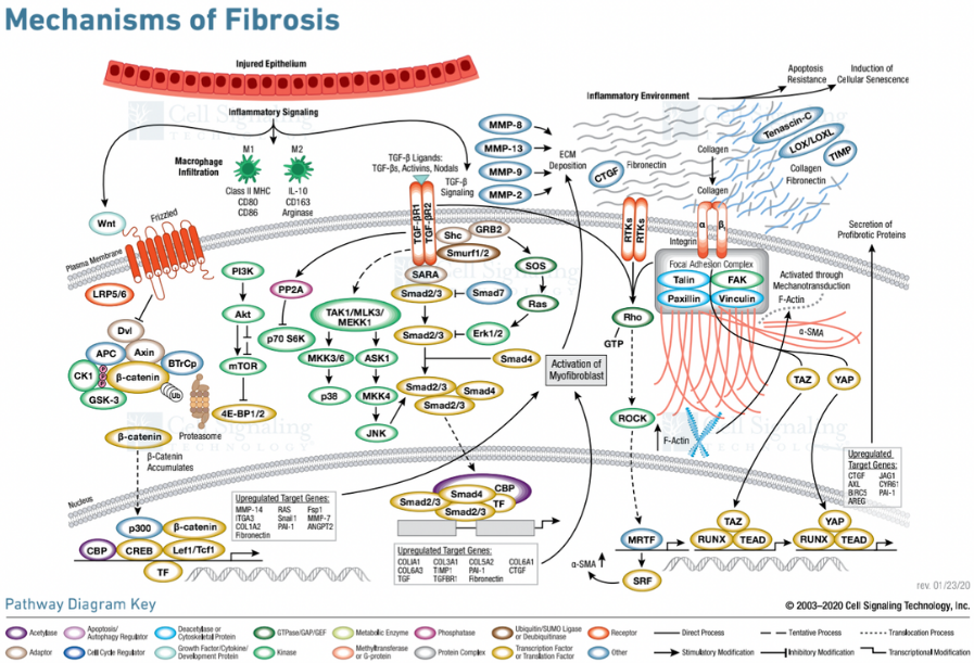 常见的与纤维化有关的疾病有:特发性肺纤维化(idiopathic pulmonary fibrosis,IPF)、肝硬化、慢性肾病、心肌梗死、心力衰竭以及非酒精性脂肪肝炎(NASH)等。纤维化还影响肿瘤侵袭和转移、慢性移植物排斥和许多进行性肌病的发病机制。除器官损伤外,纤维化还与癌症进展有关,因为纤维化ECM可刺激细胞增殖并改变细胞极性,从而促进肿瘤发育和生长。