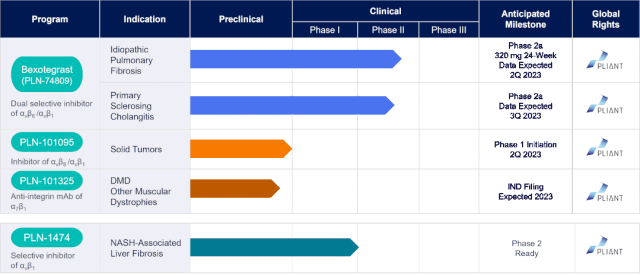 在2022年7月和2023年1月,Pliant公布了2A期Integris-IPF试验的积极中期数据。预计将在2023年第二季度公布Integris-IPF试验的最终数据,在2023年第三季度公布PSC 2A期试验的中期数据。