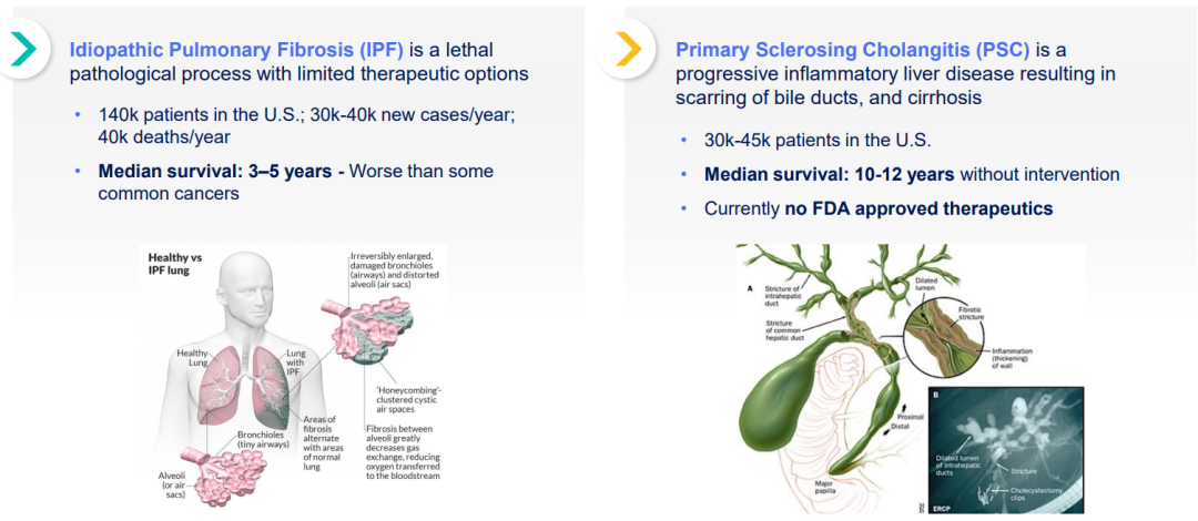 - 1.通过IPF和PSC的临床开发和商业化,快速推进Bexotegrast.Pliant正在开发αVß6和αVß1的主要口服小分子抑制剂,作为IPF和PSC的新疗法,这两个领域都有很高的未满足的医疗需求。IPF和PSC都是罕见病,Pliant期望可以在关键地区实现商业化。