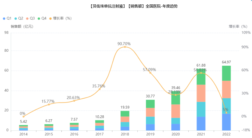 贝伐珠单抗注射液是抗肿瘤药物里的王牌品种,2022年再次稳居榜首,这也是其夺冠的第二年。2019年12月6日以前,该药在国内由原研罗氏独家生产销售。截止目前,国内已有齐鲁制药(国产首家)、信达生物、博安生物、盛迪亚生物、百奥泰生物、贝达药业、东曜药业、复宏汉霖、正大天晴9家企业获批。
