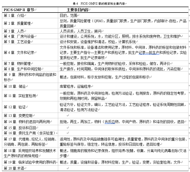 将PIC/S GMP与中国GMP(2010修订版)作对比(表3)。PIC/S GMP有Ⅰ、Ⅱ两部,较中国GMP体系庞大,内容丰富,条款多。中国GMP虽然涉及原料药的一些内容,但没有原料药的专门规范;而PIC/S GMPⅡ部是专门的原料药GMP。中国GMP共有14章、313条、12个附录;PIC/S GMPⅠ部是一般医用品GMP,共9章、272条,PIC/S GMPⅡ部共20章、373条,20个附录(表4)。