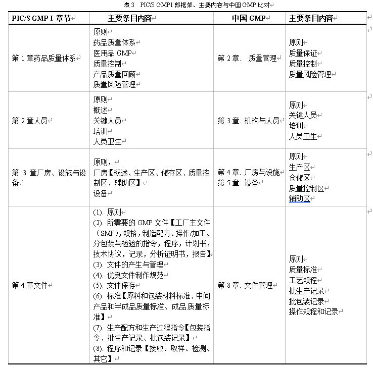 PIC/S GMP Ⅰ部只对整个药品生产质量管理过程作了一般性规定,对于一些特定领域的生产活动、特定的制造工艺,由单独的指南作为附录做出详细的指导。在每章开始,先提出对本章内容的一般原则性要求,然后分项目提出各个环节的具体要求。在框架上,PIC/S GMP Ⅰ部与中国GMP较为接近。在质量体系中,“产品质量回顾”是中国GMP没有涉及的,PIC/S GMP Ⅰ部对此部分详细规定:对所有经许可的药品,含出口专用产品,应每年进行一次产品质量回顾,并予以文件化:对原料及包装材料,特别是新供应商的审核,尤其是原料药供应链的可追溯性审核;对关键过程的控制与最终产品质量的回顾;不符合规定的所有批次及其调查的回顾;偏差调查及所采取的矫正预防措施的回顾;对工艺规程及分析方法变更的回顾;上市许可变更所提交、批准或拒绝的文件的检讨,包含出口专用文件在内;稳定性检测结果及任何不良趋势的检讨;所有与质量相关的产品的退回、投诉与召回及当时所做调查的回顾;产品生产与设备校正关系的回顾;为新上市许可与变更上市许可所做的上市后许诺的回顾;相关设备与公用设施的验证状态,如空调系统(HVAC)、水系统、压缩气体等。PIC/S GMP Ⅰ部详细地规定了文件的保存:应清楚界定与每个生产活动相关的记录及其存放处。必须具备安全管制,以确保记录在整个保存期间的完整性,且合适时必须进行确认;对于药品的批次文件,必须保存至该药品有效期后一年,或保存至该批次经由被授权人认定后至少五年,两者取其较长者;对于研究用药品批次文件必须保存到该批次的最终临床试验完成后或试验正式中止后至少五年。而中国GMP并没有对此进行详细的说明。在生产方面,PIC/S GMP Ⅰ部规定了当出现因生产限制造成的产品短缺时,所要采取如下措施:制造厂应向上市许可持有人报告可能导致供应异常的任何限制条件,以便上市许可持有人根据其法定义务向主管机关报告供应限制。这部分是中国GMP所未提及的。在投诉和产品召回方面,PIC/S GMP Ⅰ部比中国GMP多了对投诉(包括质量缺陷投诉)的处理和调查程序,调查与决策制定,根本原因分析及纠正与预防措施的详细说明:专人负责管理投诉和质量缺陷调查,并实施风险降低措施;应制定书面程序,描述收到投诉后采取的行动;所有投诉都应进行记录和评估;应记录与可能的质量缺陷有关的报告信息,包括所有原始细节;所有报告质量缺陷的有效性和范围应根据质量风险管理原则进行记录和评估,以支持进行相关调查和采取相应措施。由此,PIC/S GMP中有很多细节的内容需要我们不断地学习和以此为据,不断改进。