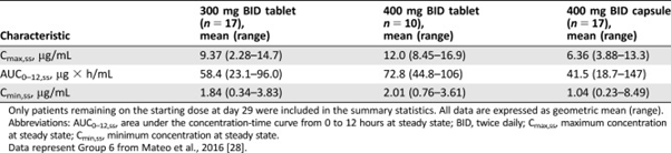 可是,给药400mg胶囊与300mg片剂,不同剂量的制剂在人体内并不等效,如下图所示: