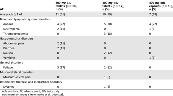 300mg BID(一天两次)剂量的片剂(两片150mg片剂)、400mg BID剂量的片剂(两片150mg片剂和一片100mg片剂)和400mg BID剂量的胶囊(8粒50mg胶囊)安全性结果见下表。虽然片剂的MTD为400mg,但300mg剂量可减少AE(不良反应)和剂量减少,表明耐受性更好,这支持该剂量成为更理想的选择。
