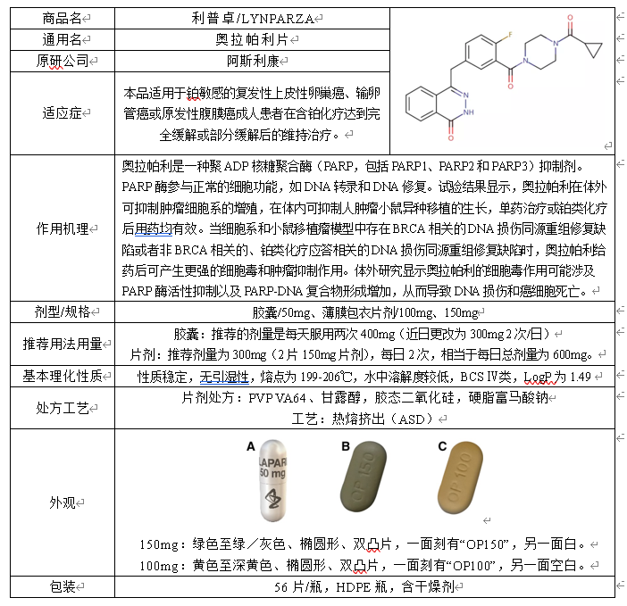 由于奥拉帕利难溶,需要先进的药物递送技术来确保生物利用度,最初批准的400mg剂量为八粒50mg胶囊,每日两次,而后开发了一种热熔挤出片剂处方(开发为固体分散体),以改善奥拉帕利的药代动力学和药效学特征,并减轻患者的给药负担。推荐的片剂剂量为300mg,每日两次(两片150mg片剂)。奥拉帕利基本信息,如下两表所示: