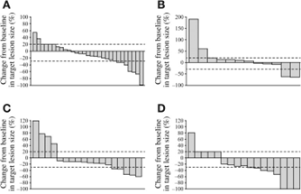 图1:16周时目标病变大小的百分比变化。(A):多次给药后,奥拉帕利胶囊400mg,每日两次(BID;n=29)。(B):多次给药200mg片剂BID后(n=13)。(C):多次给药300mg片剂BID后(n=18)。(D):多次给药400mg片剂BID(n=18)。来源于参考文献2