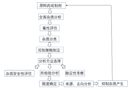 杂质谱研究的思路和策略源于QbD理念,经过多年的摸索和研究,已经从以终为始的被动控制模式转化为以源为始的主动控制模式,也就是从杂质的来源入手,结合产品的结构特点、生产工艺、处方组成、存储条件、稳定性特征等信息全面分析产品中可能存在的杂质,然后对杂质存在的可能性大小,是否容易清除、安全等级进行评估,建立适宜的分析方法,确保有效检出和确认各种潜在杂质;在此基础之上,结合生产工艺、稳定性特征,跟踪杂质在安全性或临床试验结果中产生的影响,在符合指导原则的前提下制定每个特定杂质的限度;最后是对杂质的来源和去向进行分析,通过工艺控制、包装改进或储存条件调整来有效抑制杂质的产生,从源头上有效把控杂质。
