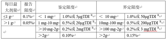 ICH Q3A和Q3B中分别给出了原料药和制剂产品中杂质限度汇总表。