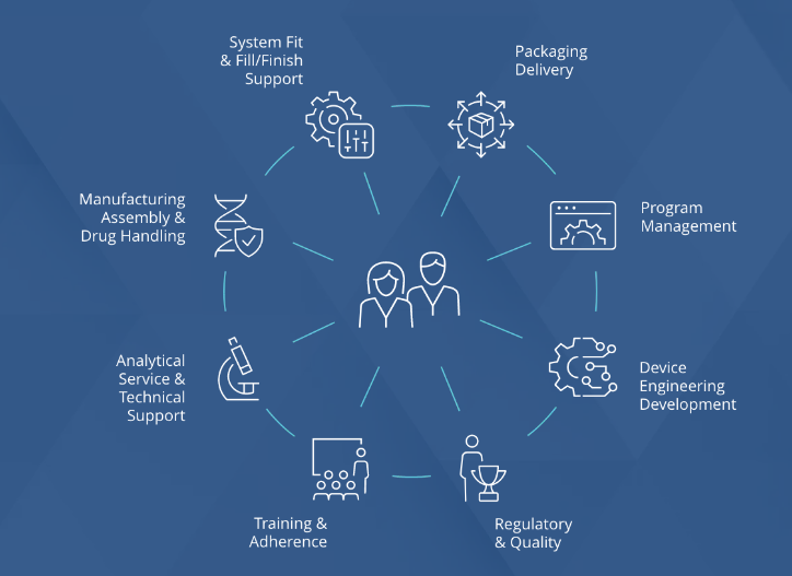 西氏医药包装提供的分析服务包括可提取物和可浸出物分析、包装和设备组合产品测试、颗粒分析、容器密封完整性测试、基础测试和DeltaCube™建模平台;合同制造团队帮助客户开发和商业化医疗设备、给药系统和组合产品,该团队专注于通过提供从产品概念化到制造和最终包装的解决方案来满足药企的需求。