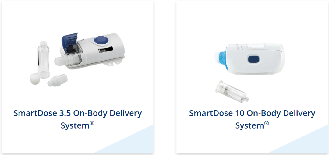 SmartDose 3.5体内给药系统和SmartDose 10体内给药系统是一种药物输送系统,由一个电池供电的、可穿戴的体内注射器组成,该注射器带有一个单独的、可预填充的、基于聚合物的药筒,该药筒填充有药物产品。