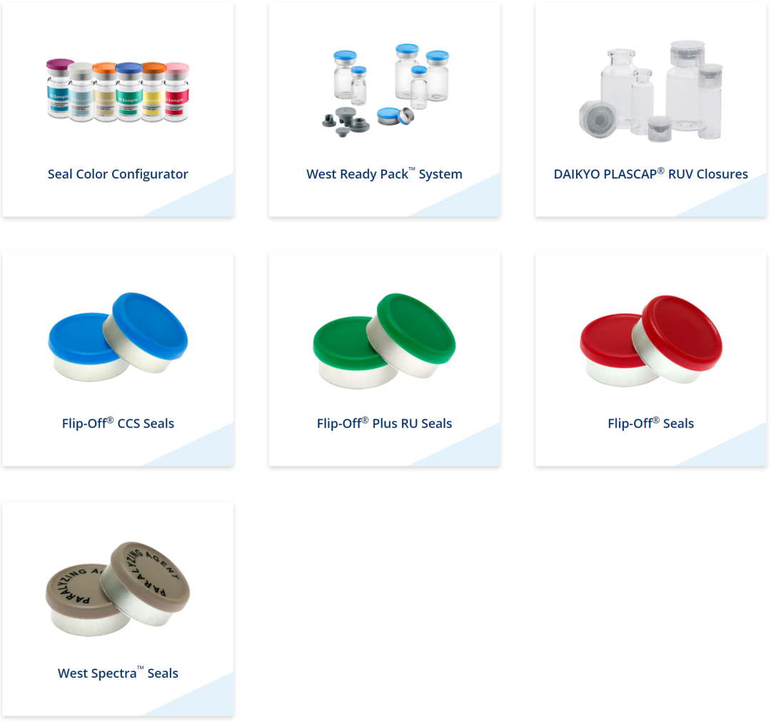 西氏医药包装部分创新产品有:(1)West Ready Pack™与康宁Valor®RTU药瓶结合的密封解决方案;(2)Daikyo CZ 2.25ml插入针环系统;(3)FluroTec 5~10ml药筒柱塞。