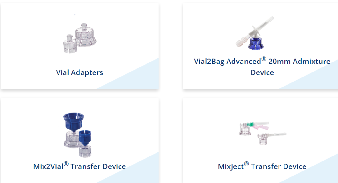 西林瓶适配器设备主要用来实现药物重组、混合和转移。该系统主要包括西林瓶适配器、Vial2Bag Advanced® 20mm外加剂装置、Mix2Via转移装置和MixJect转移装置。