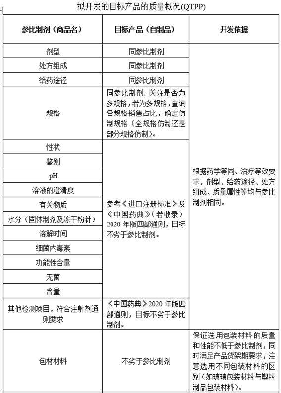 《注射剂项目研发生产策略全解析》中(第一篇处方前研究)及(第三篇研发策略制定),确定了参比制剂、附带溶剂和配件(若有)、仿制规格、包材及原辅料信息,通过查询药典、法规及参比制剂资料等信息,确定原辅料、包材及制剂标准,形成了目标产品质量概况(QTPP)。