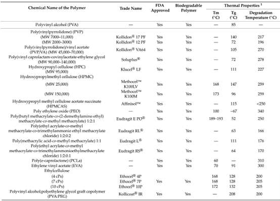 图表4 HME常用聚合物的代表及性质(Polymer Selection for Hot-Melt Extrusion Coupled to Fused Deposition Modelling in Pharmaceutics)