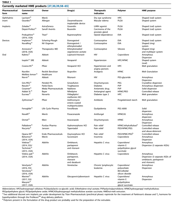 图表3应用HME技术的常见市售化合物(Hot-melt extrusion in the pharmaceutical industry: Toward filing a new drug application)