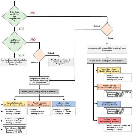 当单一的聚合物不能满足需求时,可以考虑使用不同聚合物组合使用改善粘度、流动性、获得良好的力学性质(脆性)、控制或改善溶出行为、挤出温度来获得最佳可挤出性、可打印性和药物释放行为。