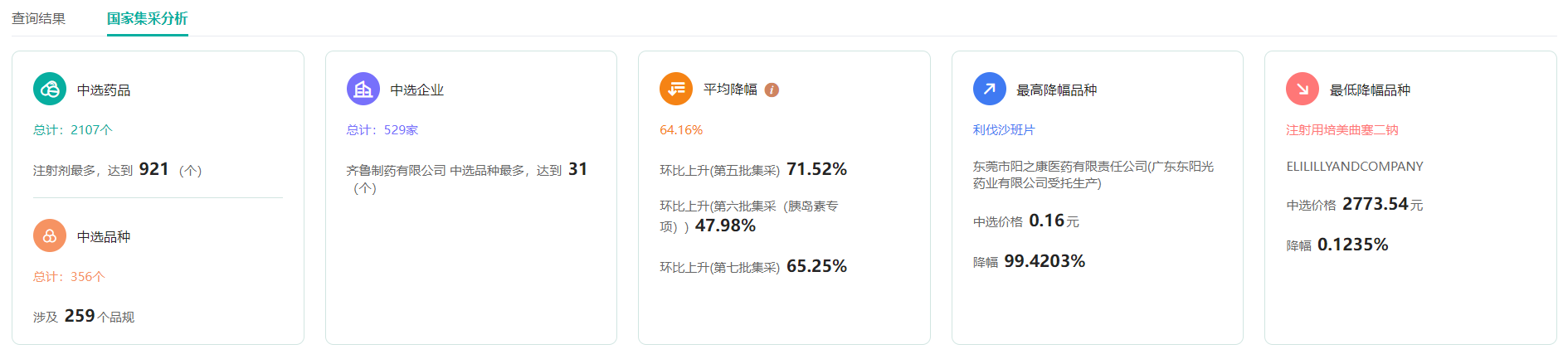 据药融云数据库统计,在目前开展的8批国家药品集采里,最高降幅品种为利伐沙班片,中标企业为东莞市阳之康医药(广东东阳光药业受托生产),中选价格为0.16元,直降99.42%;最低降幅品种为注射用培美曲塞二钠,中标企业为ELILILLYANDCOMPANY,药品降幅0.12%,中选价格2773.54元。另外,中选品种最多的企业是齐鲁制药,累计共有31个。
