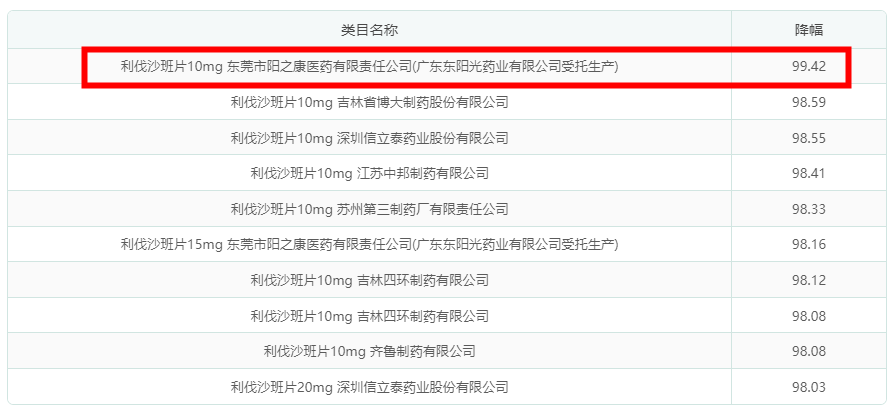 据药融云药品集中采购数据库显示,截至目前,利伐沙班片仅中选了第五批国家药品集采,共14家药企被选中。从价格上来看,可以算的上是“打骨折”,药企药品平均降价90.54%,降价98%以上的药企就有8家。