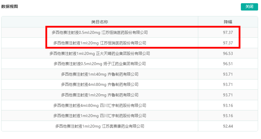 据查询,多西他赛注射液也中选了第五批国家药品集采,共涉及6家药企,分别为恒瑞医药、齐鲁制药、奥赛康药业、正大天晴、扬子江药业、汇宇制药。其中,恒瑞医药的降价幅度最为惊人,达到了97.37%,中选价格为22.6元。