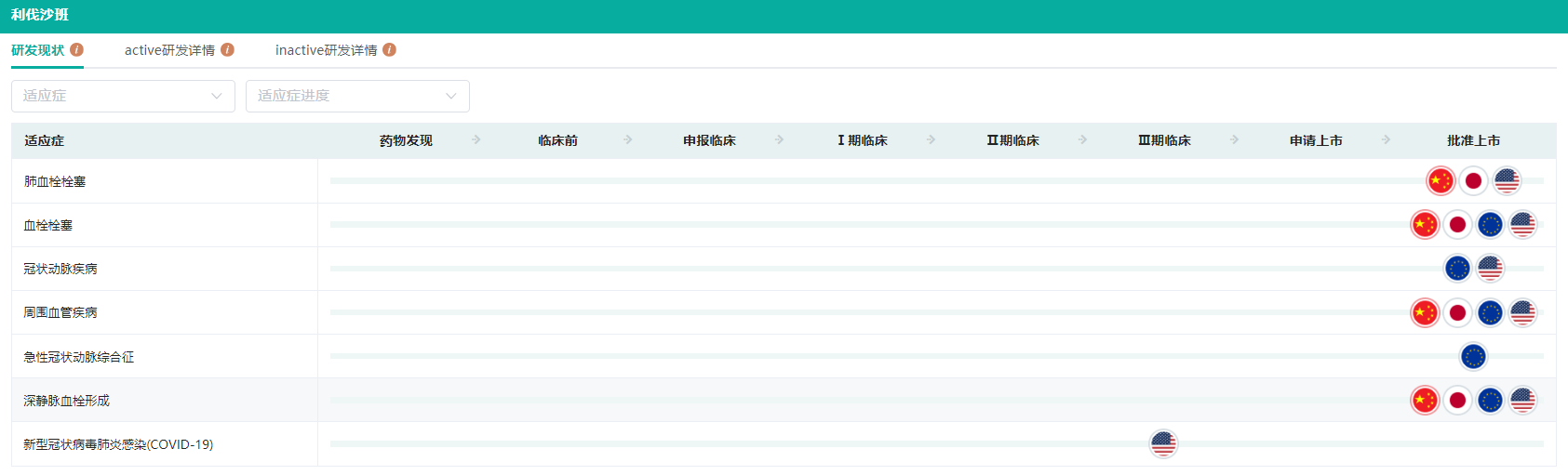 利伐沙班是拜耳原研的一款凝血因子Xa拮抗剂,于2008年首次在意大利面世。2005年拜耳与强生签订协议,许可其在美国的药物开发以及商业化许可权,预计总支付金额近3亿美元。截至目前,利伐沙班已获批了深静脉血栓形成、肺血栓栓塞、血栓栓塞、冠状动脉疾病、急性冠状动脉综合征、周围血管疾病等适应症。另外,利伐沙班还在拓展针对新型冠状病毒肺炎感染(COVID-19)的适应症,该试验现已完成招募,试验登记号NCT04508023,目前强生在美国开展的临床试验已经推进到了三期。