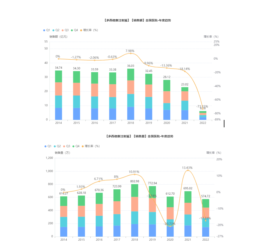 据药融云统计,多西他赛注射液在我国院内的销售额最高曾达到36亿元,销售量最高达到803万,这一盛况都发生在2018年。从那以后,就开始走下坡路,特别是2022年,销售额大跌73%,只剩6亿。反观销售量,也有减少,但不至于惨烈。自2014年开始,多西他赛注射液的院内市场一直就由恒瑞医药称霸,但在2022年,恒瑞医药市场规模缩小20%,排名第二。最大的那块饼由原研赛诺菲夺回,市场占比达到35.34%。