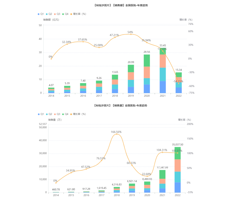 上面所罗列的2款药品,均中选了2021年6月28日发布的第五批国家药品集采,降价幅度都在90%以上,该轮集采于2021年10月1日开始执行。从药品销售图中不难看出,从2021年的第四季度开始,这两款药品的销售额都出现了暴跌,但反观销售量,浮动不大甚至还出现了暴增。由此可见,药品销售市场与国家药品集采开展、药企药品降价紧密相关。