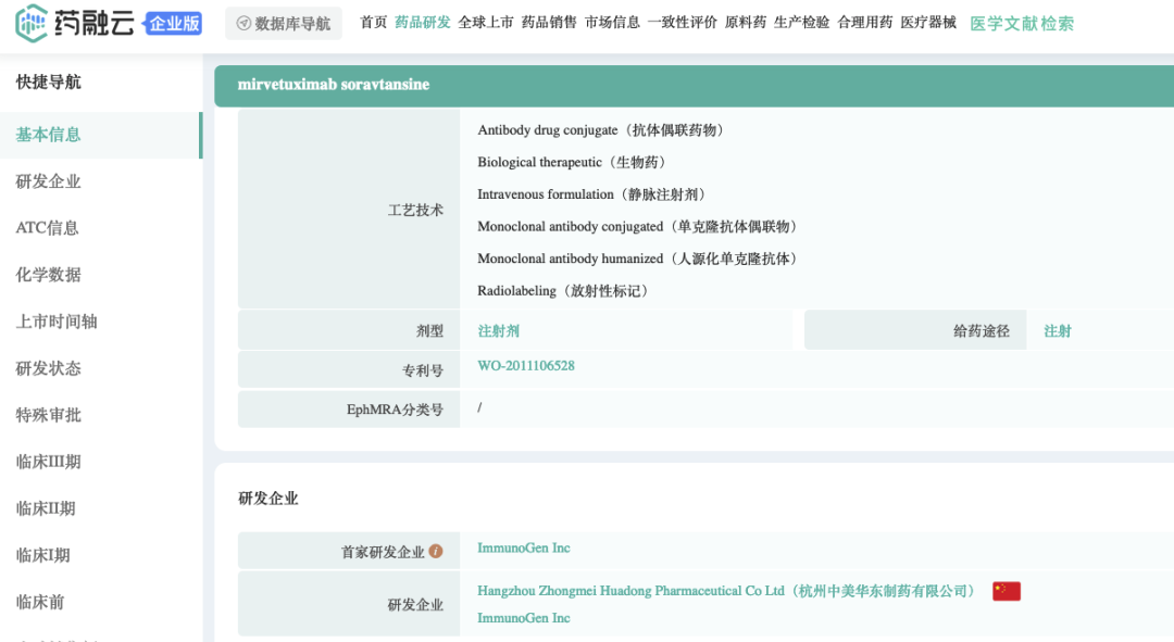 药融云数据库显示:Mirvetuximab soravtansine是华东医药子公司中美华东制药与ImmunoGen合作开发的,用于治疗铂耐药卵巢癌的全球首创ADC药物,相关专利为WO-2011106528。