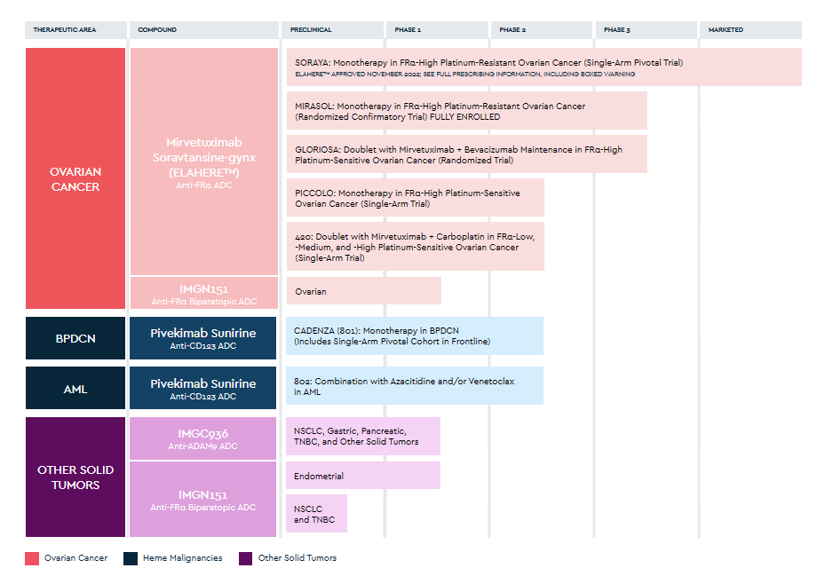 ImmunoGen目前有4款候选ADC药物,研发管线覆盖卵巢癌、恶性肿瘤和实体瘤领域。