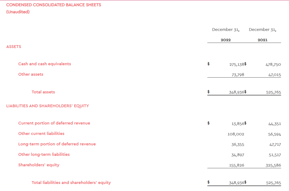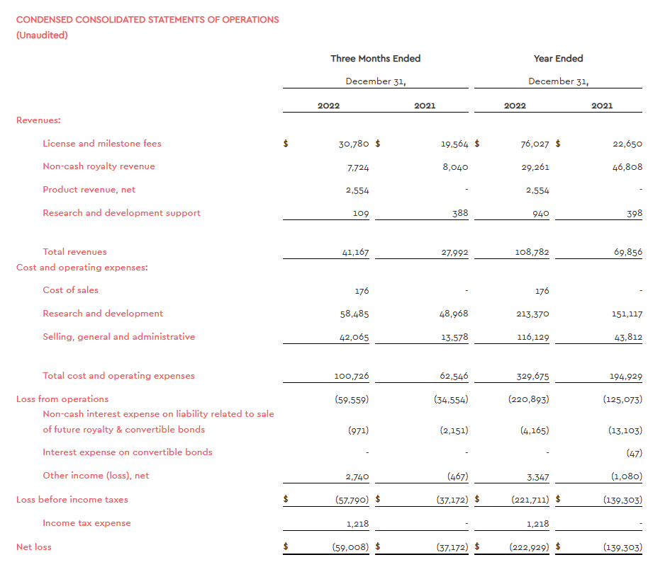 2022年ImmunoGen的净利润为-2.23亿美元,同比下降60.03%。2022财年研发费用投入2.12亿美元,相较于2021年投入的研发费用1.51亿美元,增长了6225万美元,再加上销售费用,一般和行政支出等等运营成本,2022年该公司总的成本花销为3.3亿美元,相较于2021年的运营成本,增长近1.35亿美元。