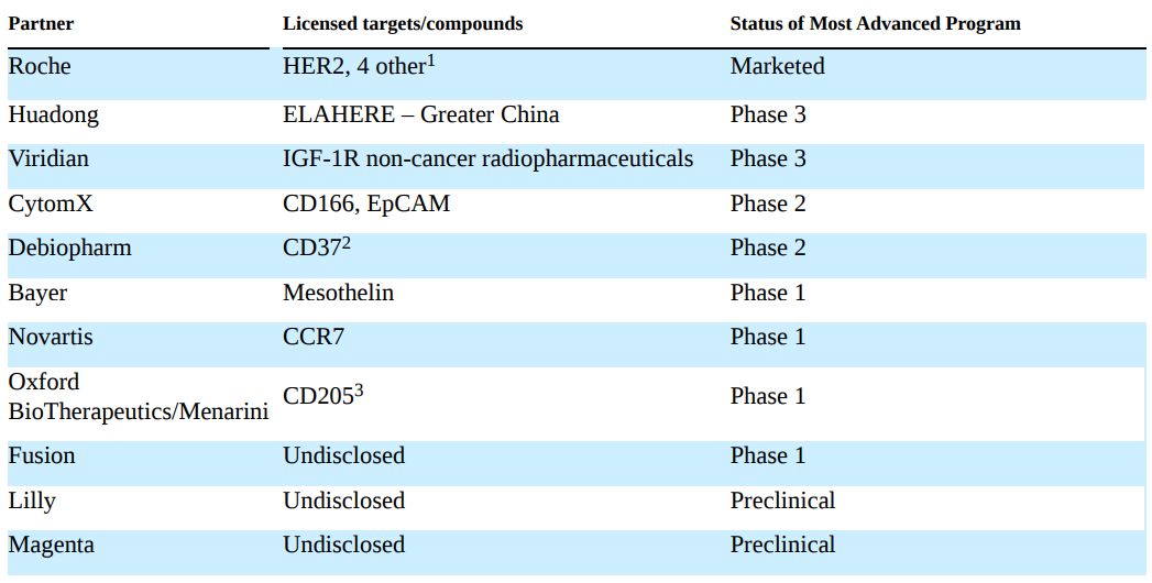 除了自研管线,对外合作授权一直是ImmunoGen公司的强项。在40年的时间里,通过对外合作ImmunoGen构建了世界上最复杂的ADC“工具箱”,重要的合作项目如下(截至2022年12月31日):