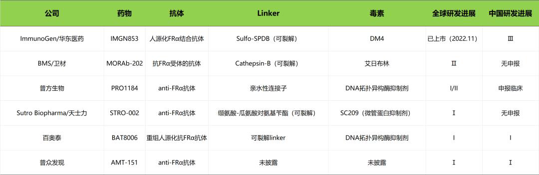 目前,全球针对FRα靶点的开发可谓百花齐放,包括FRα ADC、FRα CAR-T、单抗、双抗等,其中,卫材的FRα单抗Farletuzumab在Ⅲ期临床试验中未达到PFS终点而停止研发,Endocyte旗下的小分子偶联药物Vintafolide因未达到主要终点而宣告失败。FRα将何去何从?近年来,FRα ADC凭借卓越的疗效和安全性,逐步脱颖而出,随着首款FRα ADC药物ELAHERE®于2022年11月获FDA批准上市,FRα ADC前景值得期待,2023年有望成为FRα大红大紫的年份。ELAHERE®目前在中国处于Ⅲ期临床,有望于2023年下半年递交上市申请。