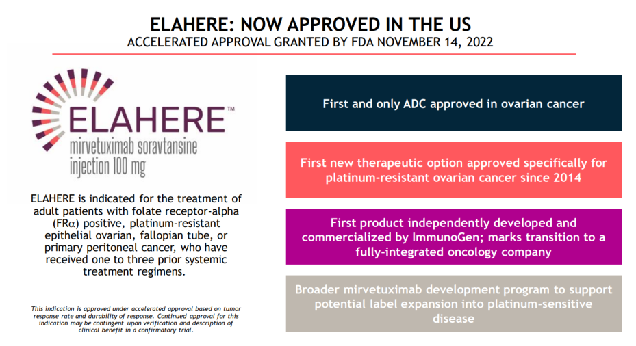 2022年5月23日,ImmunoGen宣布美国FDA已受理该产品的生物制品许可申请(BLA),并授予优先审评资格。2022年11月15日,ImmunoGen宣布该产品获得美国FDA加速批准上市。