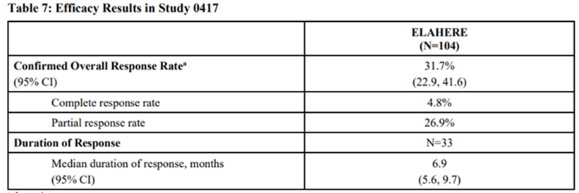 ELAHERE®是依据FDA的加速批准路径,基于关键性单臂研究SORAYA试验的客观缓解率(ORR)和缓解持续时间(DOR)数据获得批准。SORAYA试验是一项单臂研究,入组106名铂耐药卵巢癌患者,患者入选标准是FRα高表达、先前已接受过1-3线治疗方案且至少接受过一线含贝伐珠单抗治疗的铂耐药卵巢癌患者。所有患者每3周接受6mg/kg的mirvetuximab soravtansine静脉输注,直到疾病进展或不可接受的毒性。该研究的主要终点为经研究者评估的ORR,关键次要终点为DOR。研究者评估的ORR为31.7%,包括5例完全缓解(CR)。研究者评估的中位DOR为6.9个月。