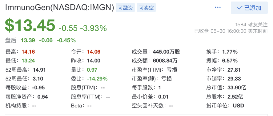 2023年5月3日,美国生物技术公司ImmunoGen对外宣布用于治疗卵巢癌的全球首创(first-in-class)ADC药物ELAHERE®在Ⅲ期临床MIRASOL试验中获得了积极的关键数据,于FRα阳性铂类药卵巢癌患者中证明了总体生存获益。该消息让ImmunoGen股价当天大涨136%,市值达到27.7亿美元。截止2023年5月30日美股收盘,公司市值约33.9亿美元。