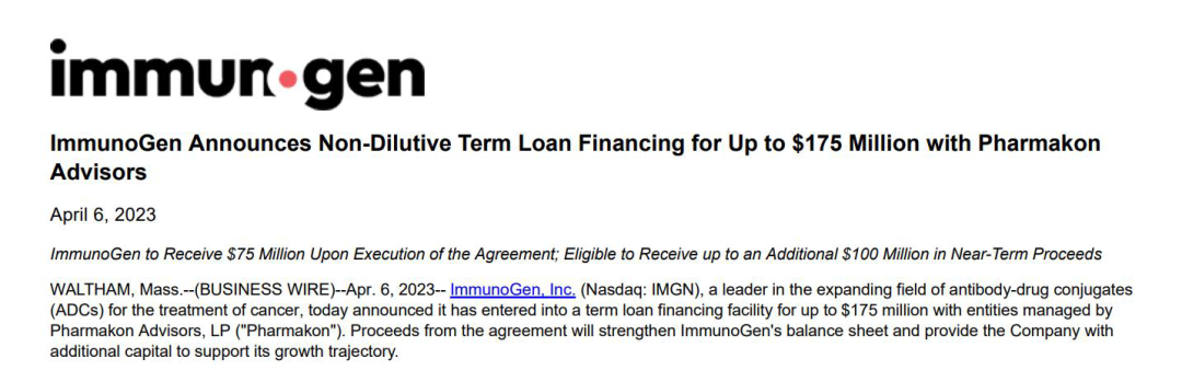 截至2022年12月31日,ImmunoGen持有现金和现金等价物共计2.751亿美元。ImmunoGen称,此现金水平和现金等价物不足以满足公司在未来12个月的当前运营计划。此前,在2023年4月6日,ImmunoGen公司宣称,已与Pharmakon Advisors(生命科学行业领先的债务资本提供商)签订了贷款协议,Pharmakon向ImmunoGen提供一项1.75亿美元的非稀释性定期贷款。