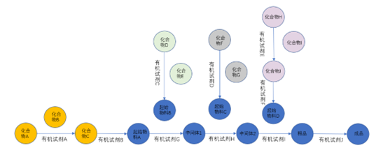 第一步:全面分析待检测药物合成路线(包括起始物料的合成路线)中使用的有机试剂,除直接使用的有机溶剂外还要分析合成过程中可能会生成的有机溶剂,这一步要尽量罗列全面,不要漏掉任何一个试剂。例如下图中有机试剂A至J都是需要控制的残留溶剂。