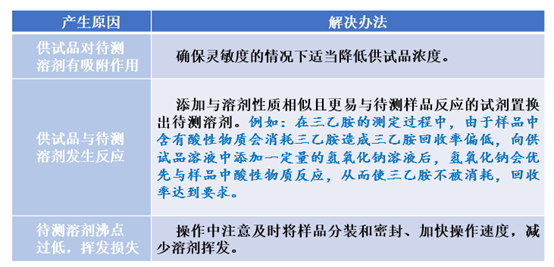 除了基质减弱效应,还有基质增强效应,结果是回收率偏高,其原因是供试品占据了色谱系统中部分活性位点,减少了色谱系统与待测溶剂的反应,造成待测溶剂响应偏高。