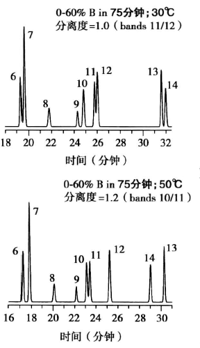 高柱温降低流动相粘度,提高分子扩散速度,改善峰型,以及选择性的变化,提高分离度,还能解决顺反互变异构峰型差的问题,这也是多肽分析的一个特点,如图2的案例。需要注意的是如果使用高柱温需要对柱前流动相进行预热2,高柱温也有一些缺点,如样品降解和色谱柱寿命下降。
