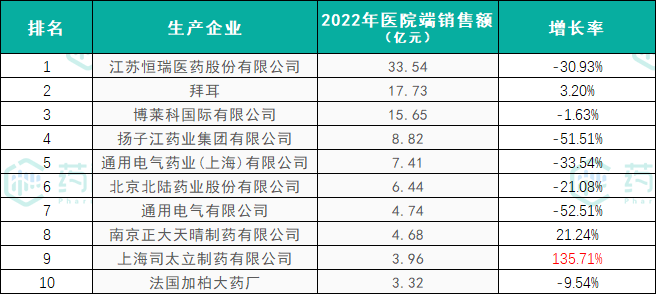 从生产企业格局来看,江苏恒瑞医药、拜耳、博莱科、扬子江药业、通用电气位居前五,占据了医院端78.67%的市场份额。从增长率来看,TOP10企业中有7个出现负增长,销量下滑最多的是通用电气,其次是扬子江药业;其中,上海司太立制药大涨136%,晋身前十强。