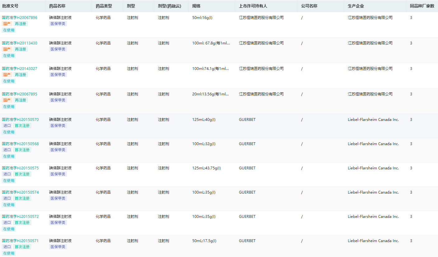 碘佛醇注射液最早于1988年在美国获批上市,目前已在全球多个国家上市销售。药融云中国药品批文数据库显示,碘佛醇注射液在国内共有132条生产批文,其中在使用的仅25条,涉及3个生产企业,恒瑞医药、Guerbet SA、Liebel-Flarsheim Company LLC。