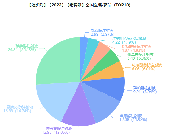 其中,2022年医院端市场造影剂销售额TOP10品种中,排名前三的分别是碘佛醇注射液、碘克沙醇注射液、碘普罗胺注射液,分别占据了26.13%、16.74%、12.85%的市场份额。