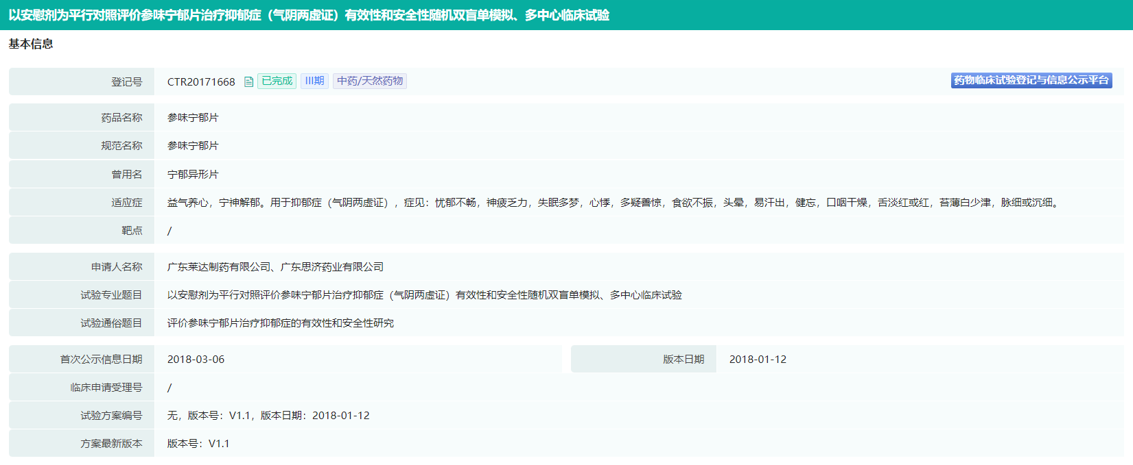 参郁宁神片临床试验登记信息(部分)